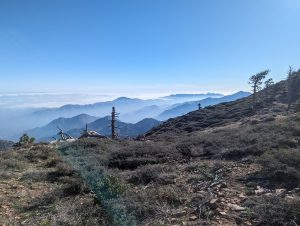 Der Weg führt mich dann entspannt den Berg hinab. Auf der einen Seite sehe ich die Wolken wieder im Tal hängen. Schnell wird mir klar, dass es die nächsten Tage wohl durch eine sehr trockene Landschaft gehen wird. Denn die Wolken kommen hier anscheinend nicht wirklich über den Berg.
