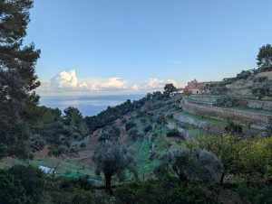 Schon bald komme ich in Biniaraix an. Ab hier zieht der Weg dann schnell an und ich laufe über eine Stunde lang steil den Berg hinauf. Obwohl es nicht wirklich warm ist, laufe ich bald im Shirt weiter, da ich ziemlich ins Schwitzen komme. Es geht über ausgebaute Steintreppe und Wege nach oben. Anscheinend bin ich auf einem alten Pilgerweg unterwegs, der steil den Berg hinauf führt. Neben dem Weg sind immer wieder tolle Terrassen angelegt und auch hier wachsen Olivenbäume.